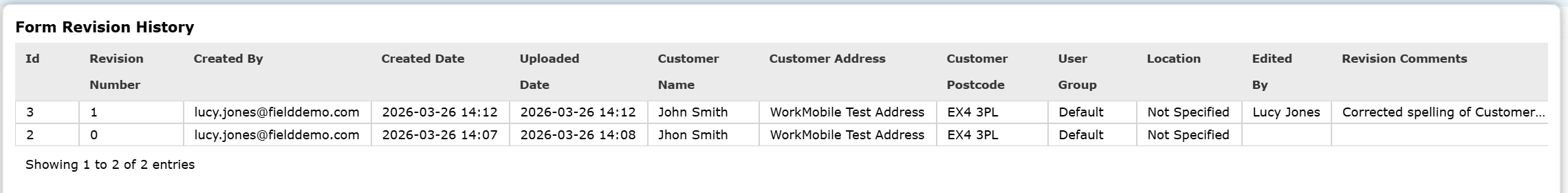 The Revision History will show all edits made to the Form data and on the right-hand side of the table it will display the ‘Edited By’ and ‘Revision Comments’