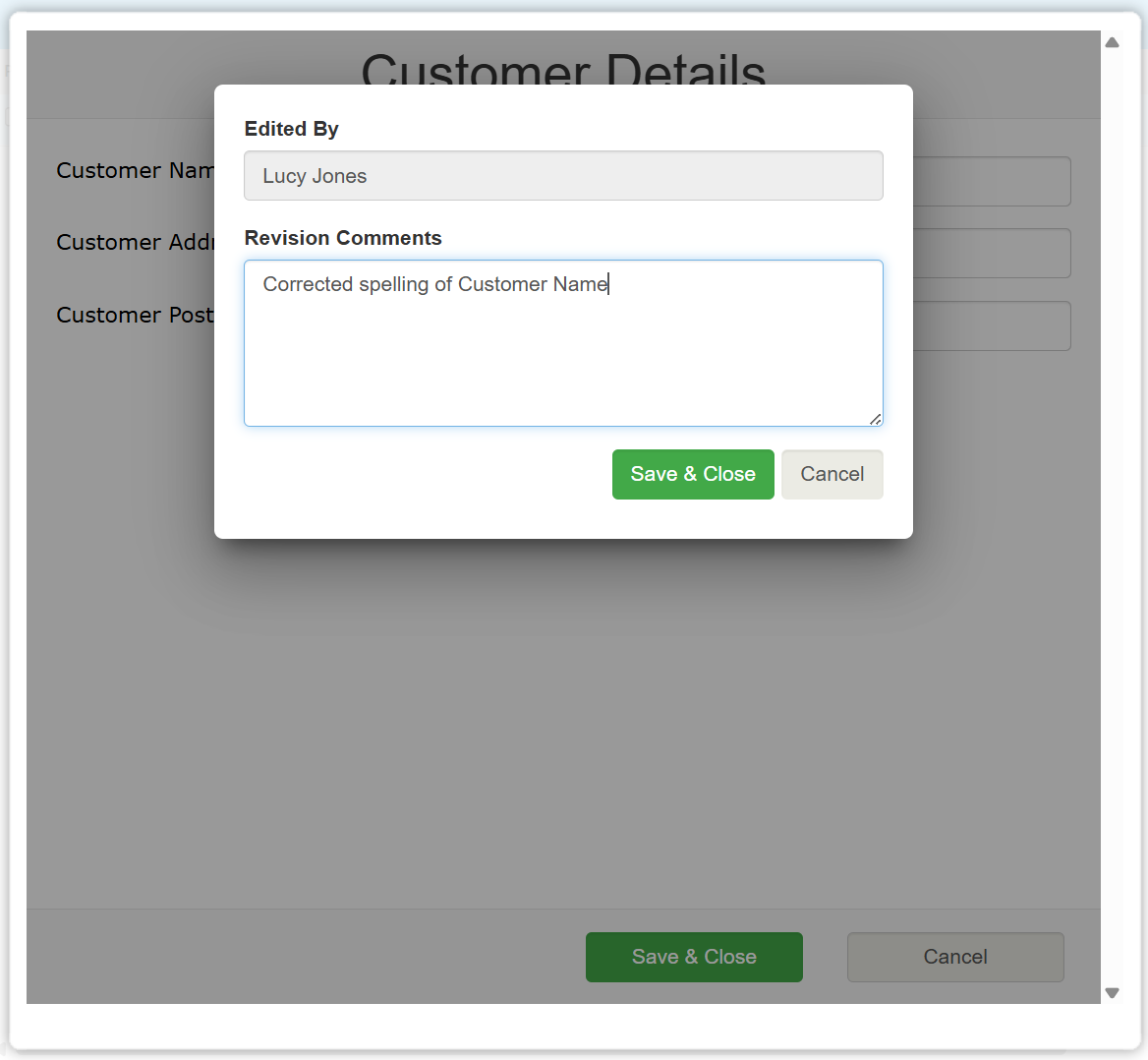 Once you are satisfied with the data provided for the Revision Comment, you can press Save & Close to confirm this. Pressing Cancel at this stage will return you to the Data Editor and allow you to continue editing data.