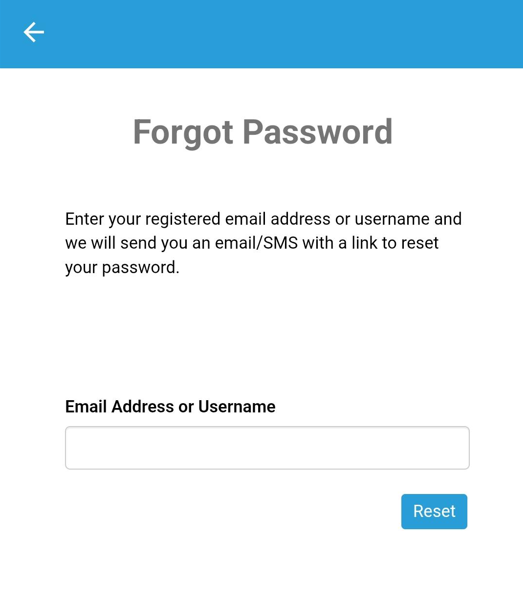 Upon clicking this option, the Forgotten Password page will be launched , and from here the user will need to confirm their Mobile Username or email address.