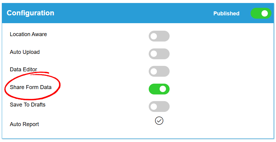 The ability to Share Form Data can be toggled for all forms on the account using the Form Dashboard option. Enabling Share Form Data for a Form will also automatically generate an Auto Report meaning users can start to share data instantly.